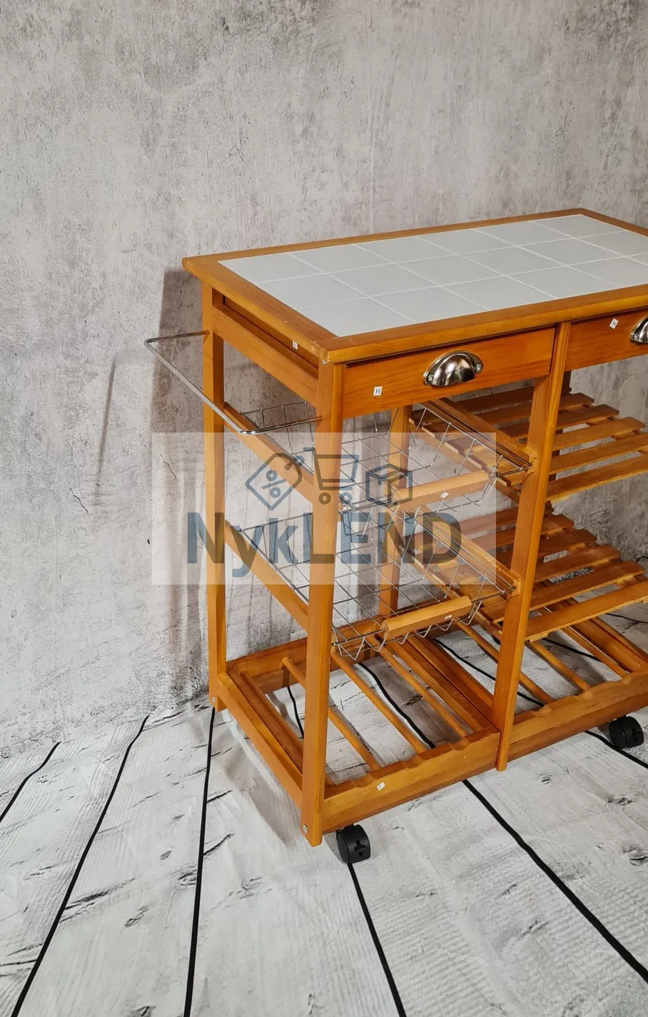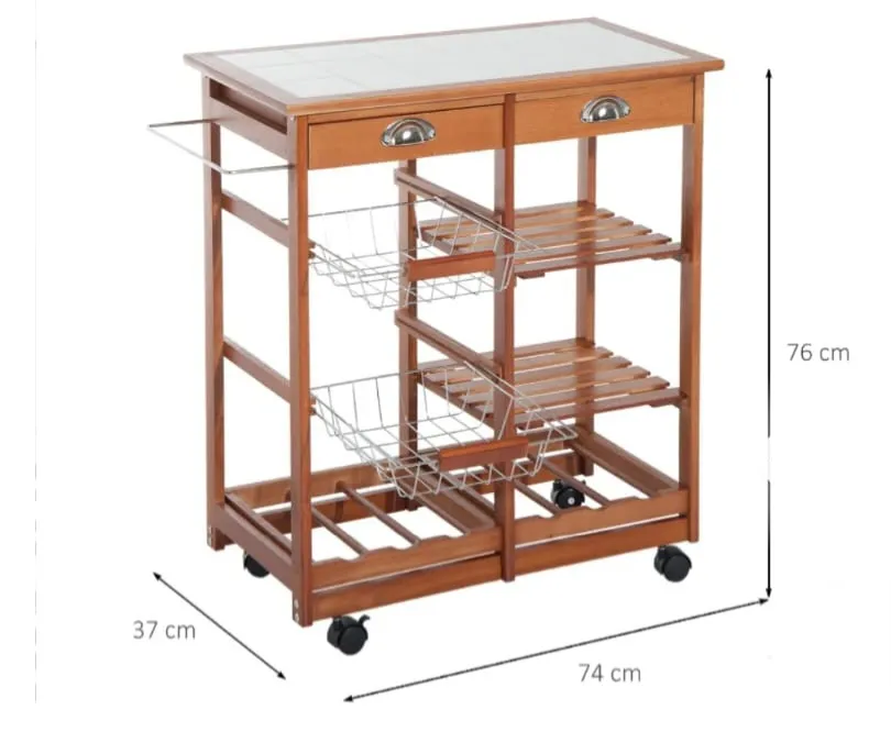 Wielofunkcyjny wózek kuchenny na kółkach, wyposażony w blat z litego drewna sosnowego, dwie szuflady, koszyki oraz zintegrowany stojak na butelki.