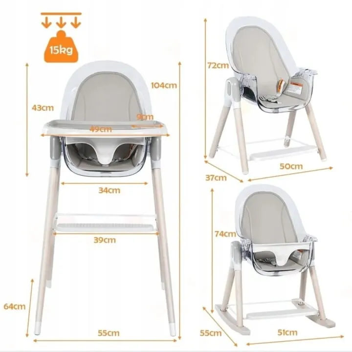 To wyjątkowe krzesełko 3w1 łączy w sobie funkcję wysokiego krzesła do karmienia, niższego fotelika do zabawy oraz klasycznego krzesła dla starszego dziecka.