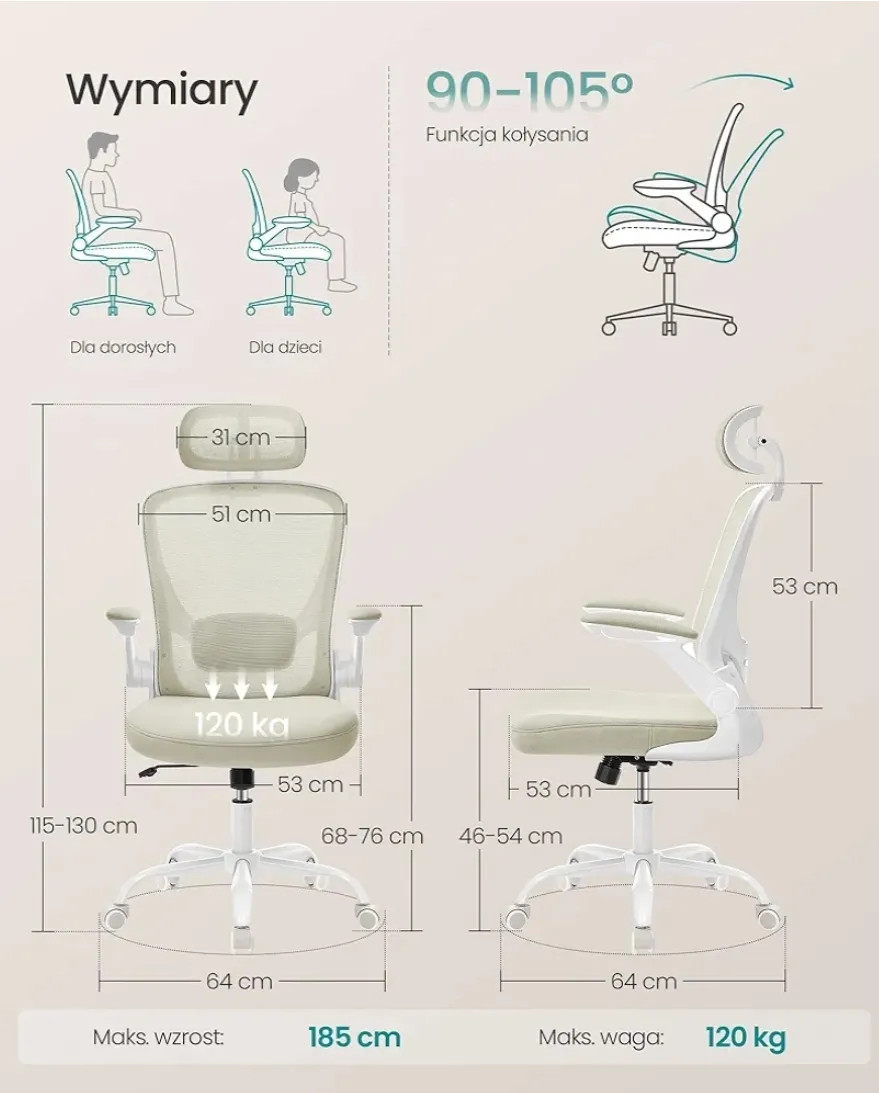 Funkcje: Regulacja wysokości, podnoszone podłokietniki, funkcja bujania.