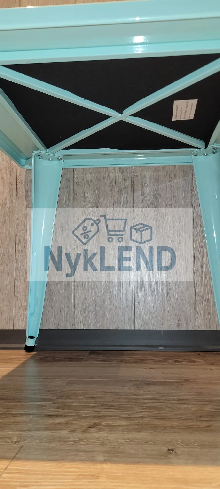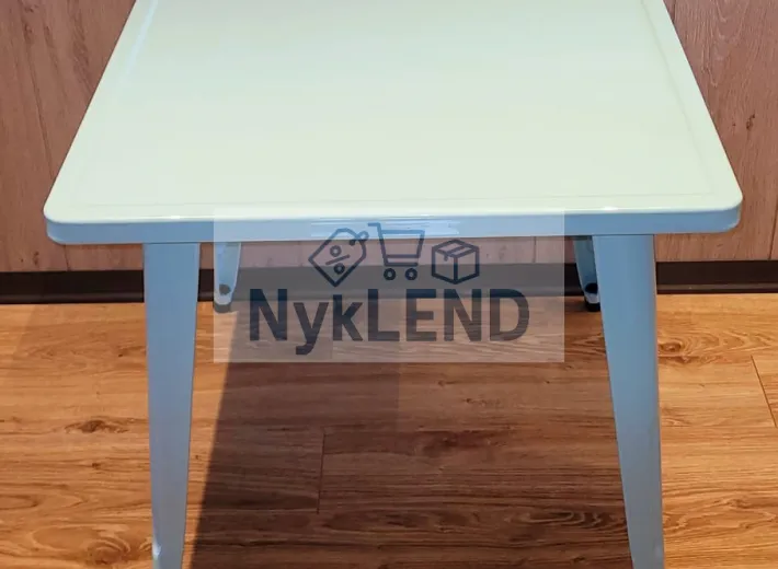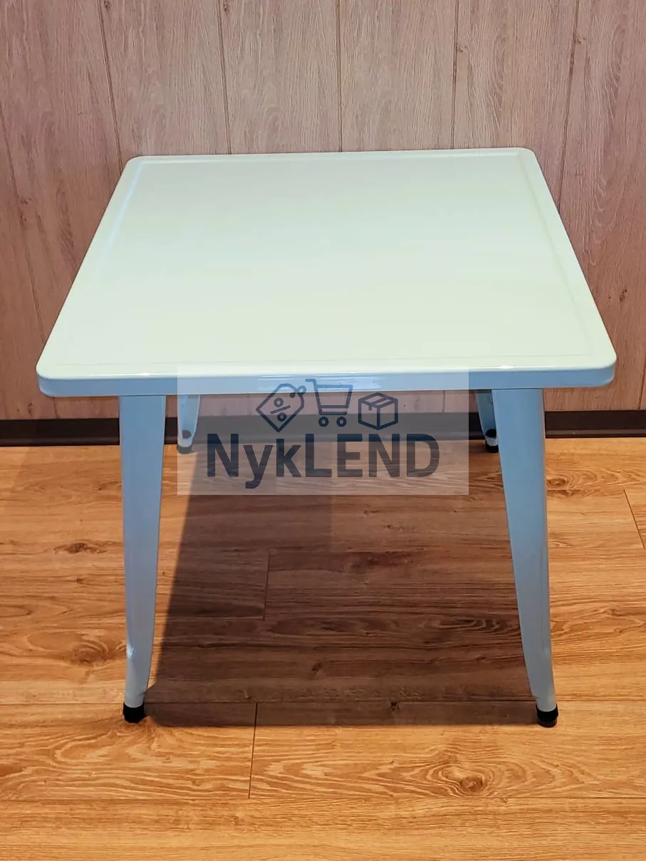 Solidny, stalowy stolik dziecięcy w nowoczesnym kolorze miętowo-niebieskim, zaprojektowany z myślą o bezpiecznej zabawie, rysowaniu i posiłkach.