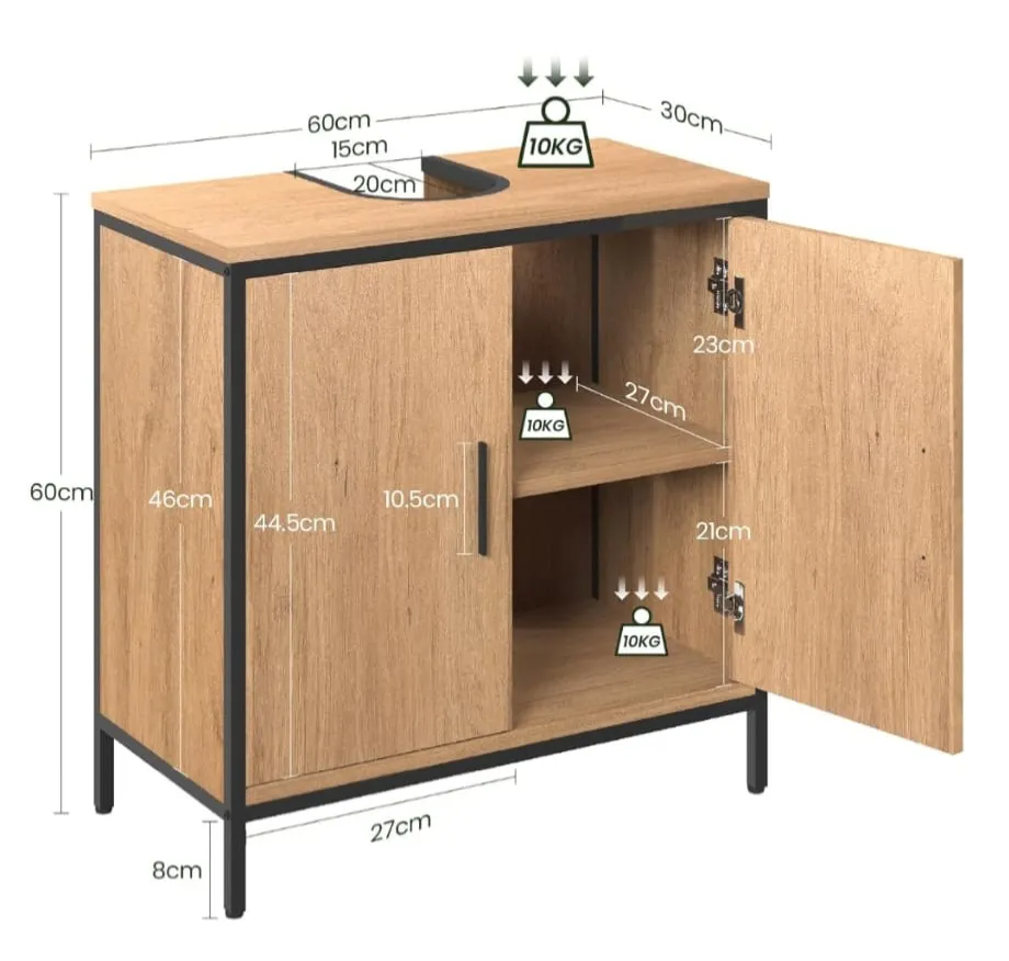Szafka EUGAD to funkcjonalny mebel zaprojektowany z myślą o maksymalnym wykorzystaniu przestrzeni pod syfonem. Konstrukcja posiada standardowe wycięcie w kształcie litery U (20x15cm), które pasuje do większości umywalek dostępnych na rynku. Wykonana z lakierowanej płyty MDF, szafka jest odporna na wilgoć panującą w łazience i łatwa w utrzymaniu czystości. Nowoczesny wygląd podkreślają drzwiczki bez uchwytów (z wycięciami do otwierania) oraz blat o fakturze dębu, co nadaje wnętrzu skandynawski charakter.