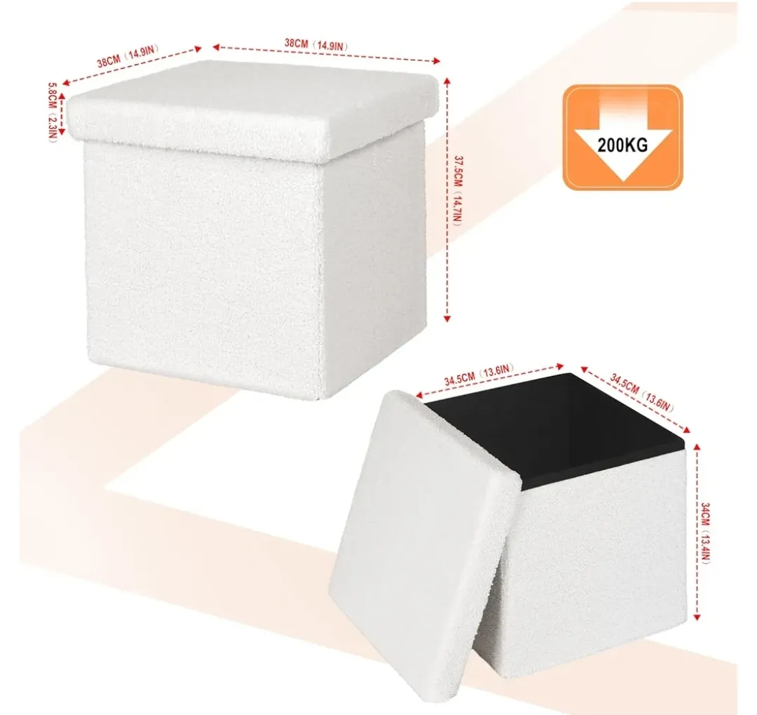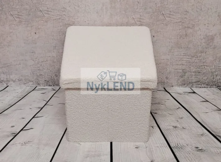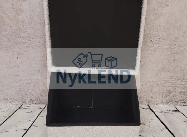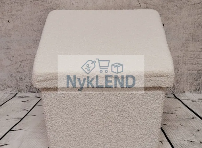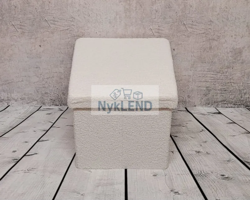 Elegancki, wielofunkcyjny podnóżek z funkcją schowka, wykończony miękką tkaniną typu „Teddy” (pluszowy polar) w kolorze białym.
